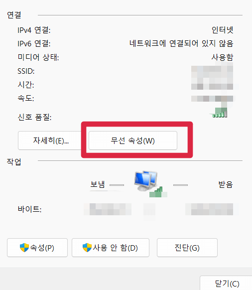 3단계: 'Wi-Fi 상태' 창에서 '무선 속성' 버튼을 클릭합니다.