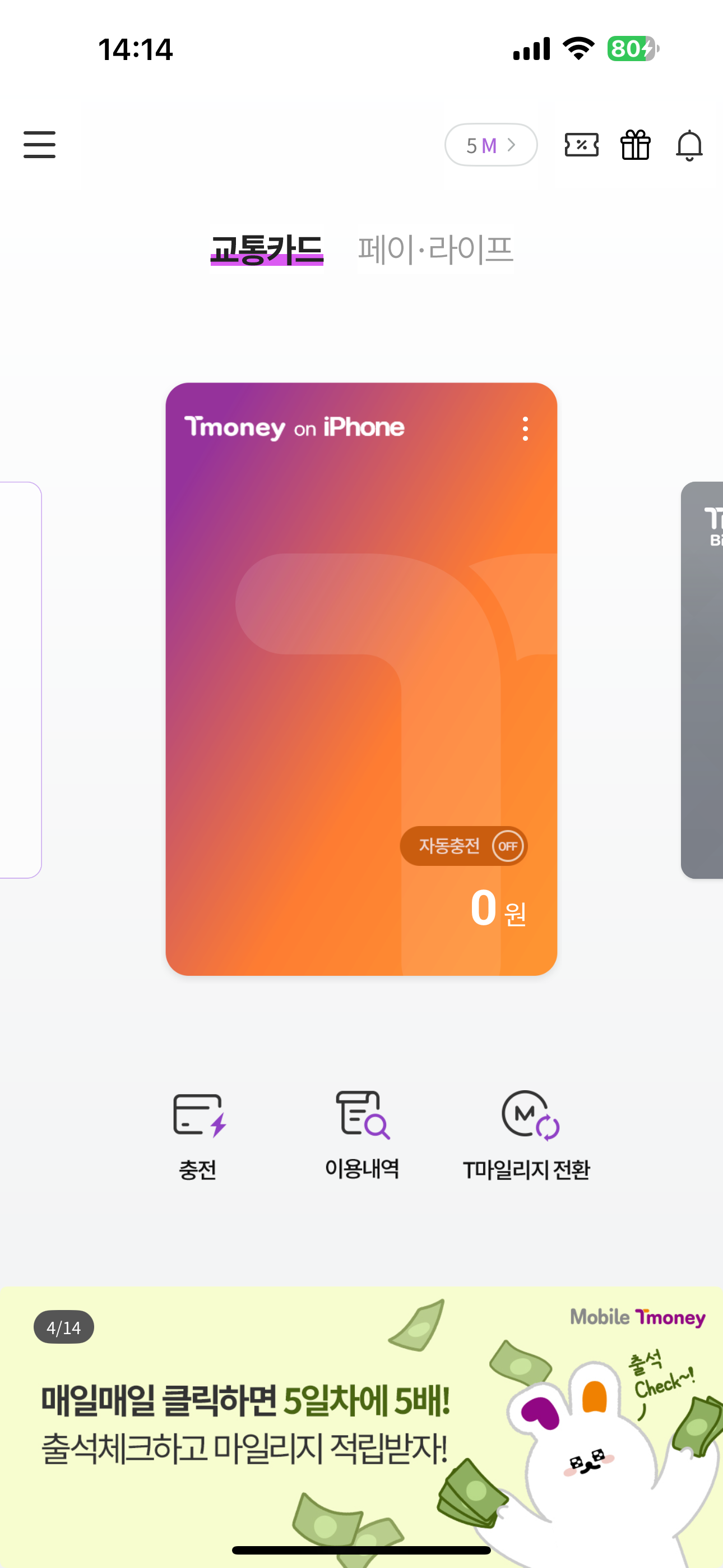 - 잔액이 부족할 경우, 미리 앱에서 충전하거나 편의점 등에서 충전할 수 있습니다.